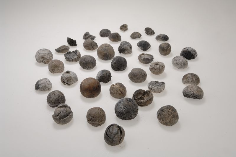 Spelbrickor, halvklotformiga med ett hål på undersida. En del är fragmentariska. Antalet är minst 36.
