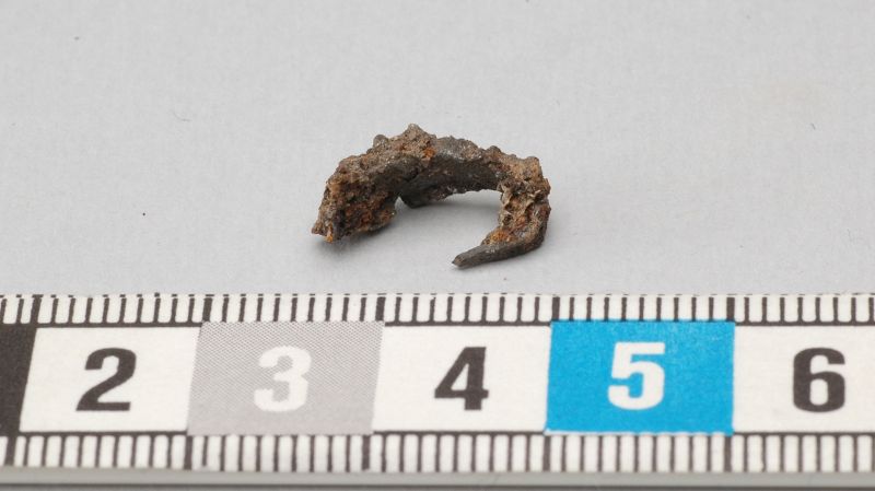 Järnkrampa, bågformigt böjd med spetsig ända.