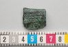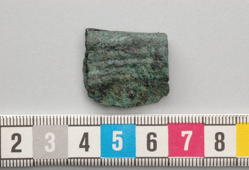 Bronsbeslag av tunn plåt, omböjd med en nit förenande de två ändarna.