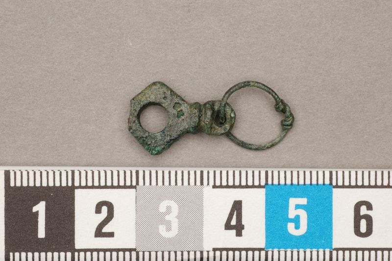 Består av rombisk platta med hål, nedtill avbruten. Hänger i en ring av tunn bronstråd.