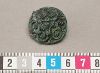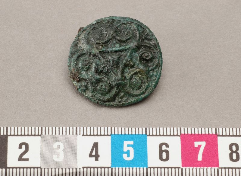 Spänne, runt, svagt kupigt. Undersidan med spår av järnnål och ögla för kedja.