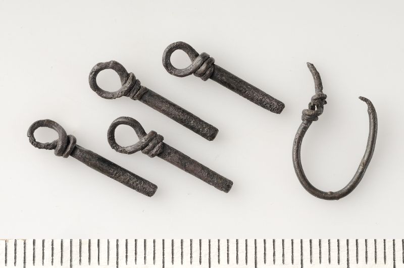 Hänge består av en ring med 4 berlocker i form av små runda stavar, omböjda i ena ändan till en ögla.