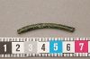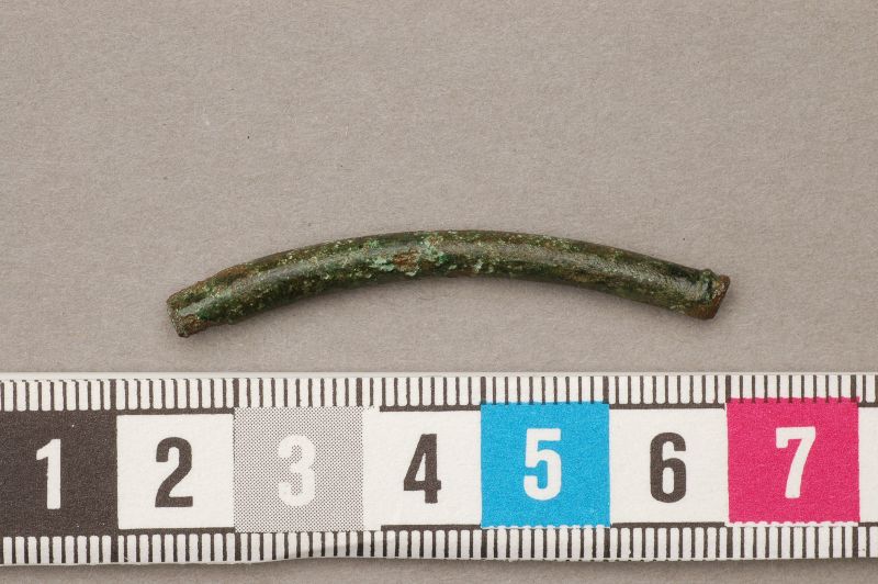 Ten, svagt böjd. Den smalare ändan tvärt avslutande och på utsidan försedd med 2 låga tvätåsar. Den andra ändan avskuren.