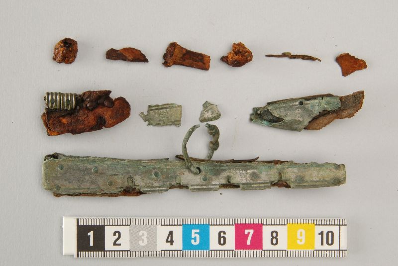 - weapon knife, weapon knife scabbard, bronze, copper alloy, iron, textile, wood, belt ring, tang