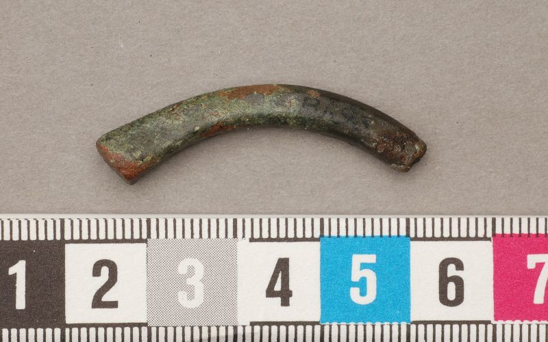 Fragment av ringspänne, rundad, fyrsidig med förtjockad. Översidan med 4 punktrader.
