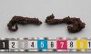 Två beslag (eller 2 halvor), en ändan upprullad. Ett beslag sammankorroderat med små stenbitar.