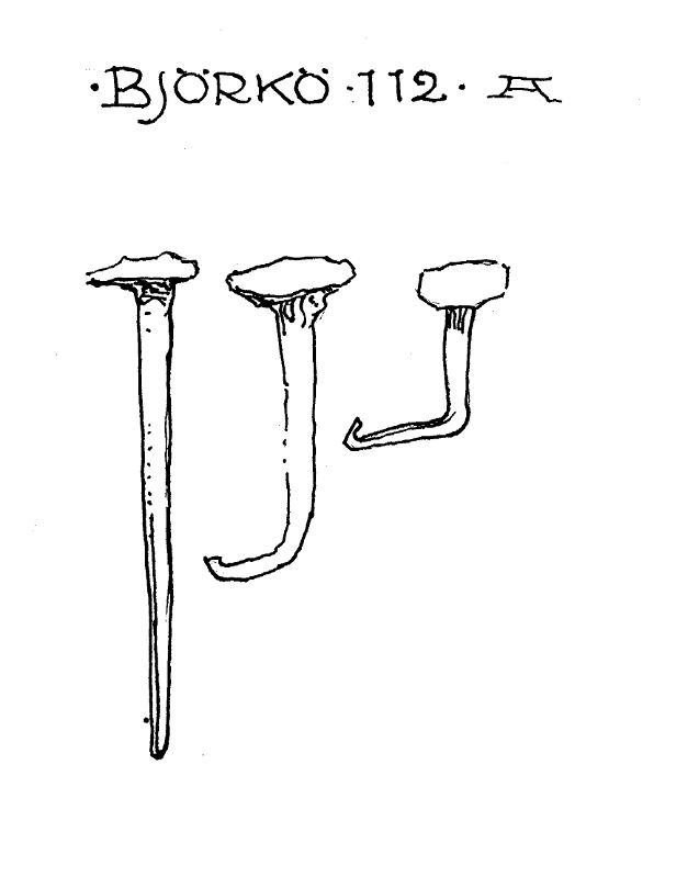 Nitar och nit och/eller spikfragment, många sammankorroderade med ben- och träbitar: 26 hela klinknaglar, mera eller mindre skadade, 26 nitfragment, 2 nitar sammankorroderade med nit/spikfragment och benbitar, 2 spikar, 1 spikten, 85 nit/spikfragment.