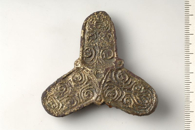 - brooch, threefoil brooch, bronze, copper alloy, iron, gilded