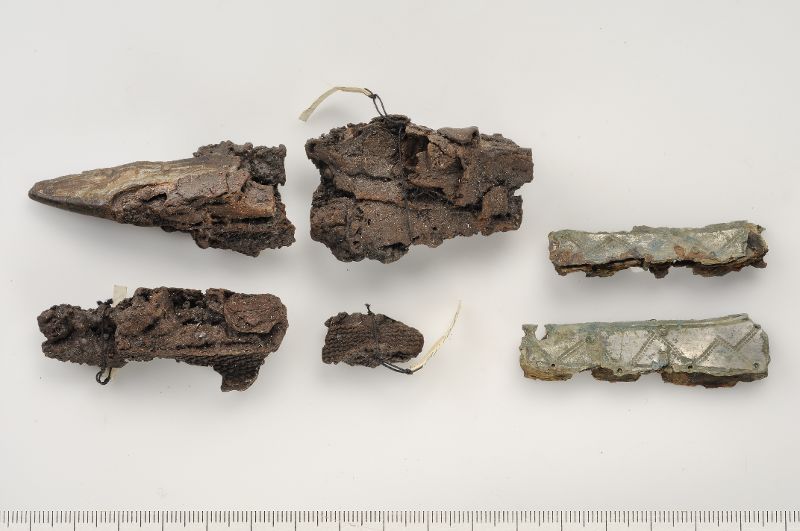resterna av 1 praktkniv med beslagen slida samt vidsittande, fossilerade, textilier. Ev. kan även rester av saxen finnas i korrosionen.