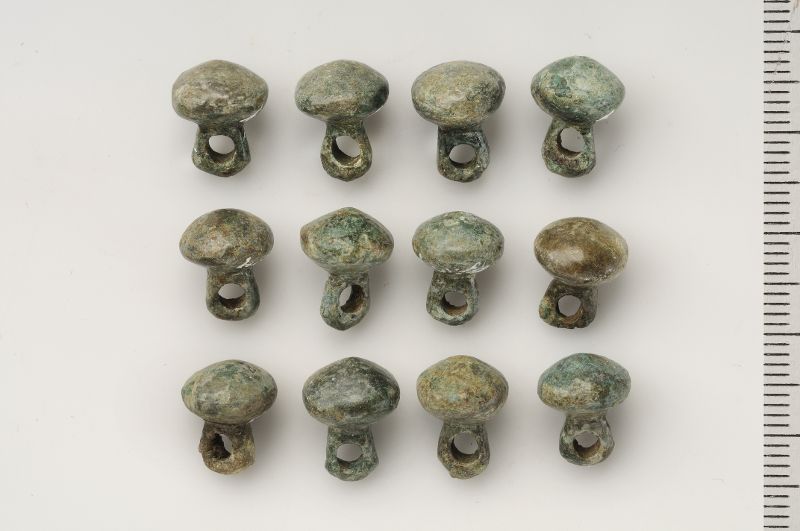 12 kaftan-/svitaknappar. 1 med rester av tråd i öglan.