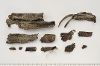 Ett 10-tal fragment av 1 kamfodral av läder. Bland fragmenten kan finnas bitar av börsen från samma grav.