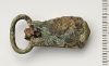 Skadad remsölja med bortkorroderad järntorne - till det beslagna bältet i Bj 1074. 1 läderfragment från bältesremmen ligger i samma ask.
