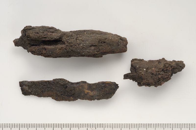 3 fragment av sönderfallen kniv med vidsittande slida.