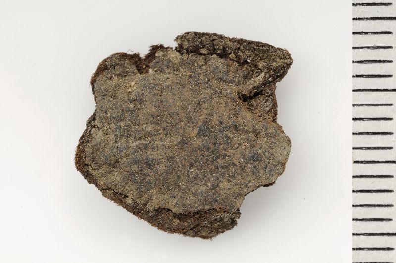 Läderfragment. Sannolikt från bältesremmen då det bär spår av ärg.