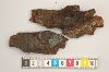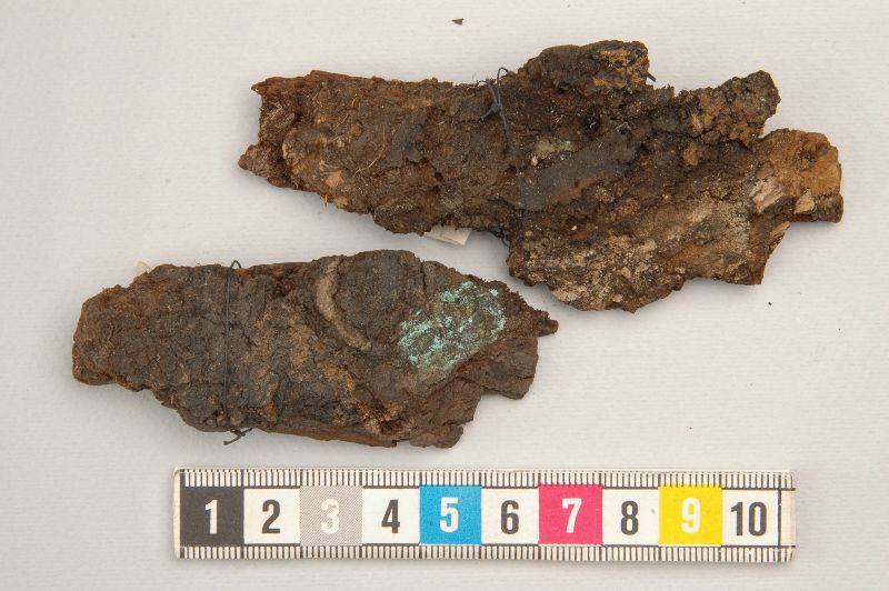 2 träbitar med vistittande läder-, textilrester och smulor.