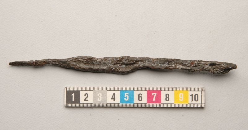 Något tillplattad, rektangulärt i tvärsnitt ten, spersad i ena ändan.