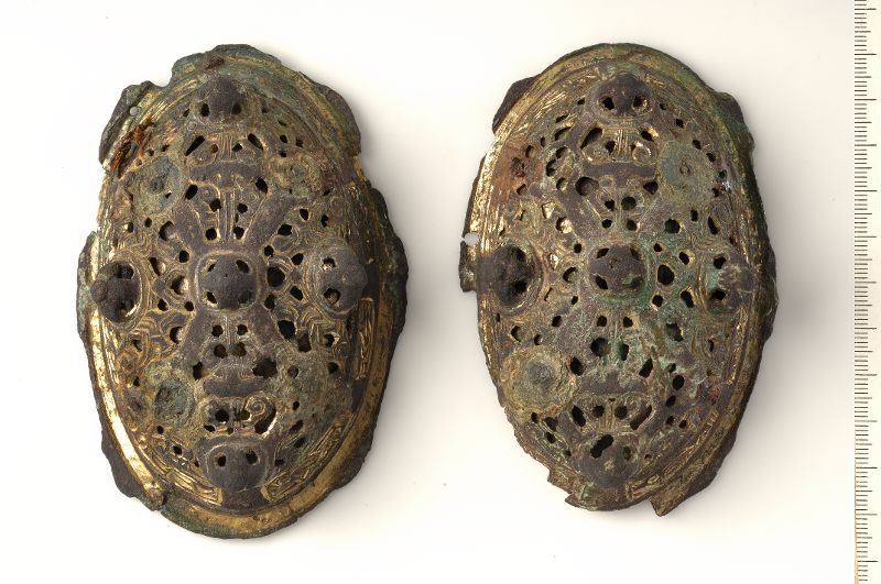 spänne (oval spännbuckla) av brons, förgyllning, järn, textil