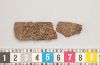Fragment av bandformigt beslag med trärester (?) och spår av bronsnitar.