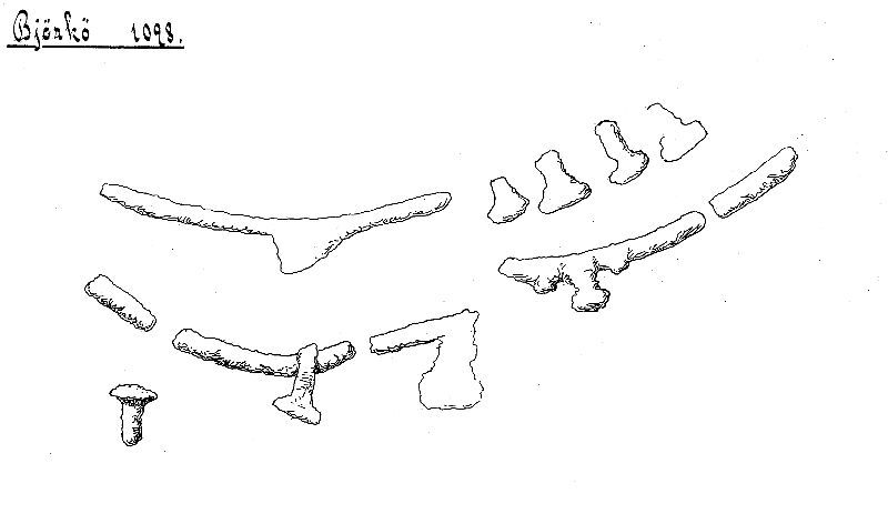 - Jfr. Taf. 107:3. 2 ringfragment är tjocka - ev. hör ej till den torshammarringen.