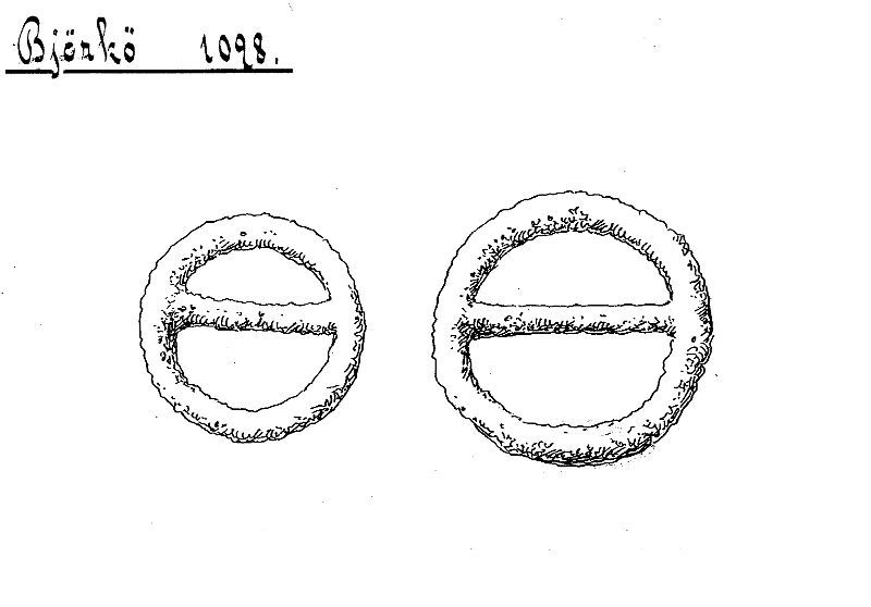 2 bärringar: den ena helt med vidsittande stark korroderat fragment av krampa, den andra delvis bevarad.