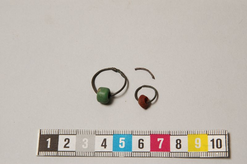 2 ringar av silvertrådar (varav 1 - räfflad) med pärlor och 1 fragment av räfflad silvertråd.