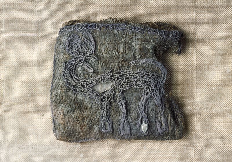 Broderat mönster/motiv föreställande en bakåtblickande hjort. Broderi i silver på siden. Taf. 36:4