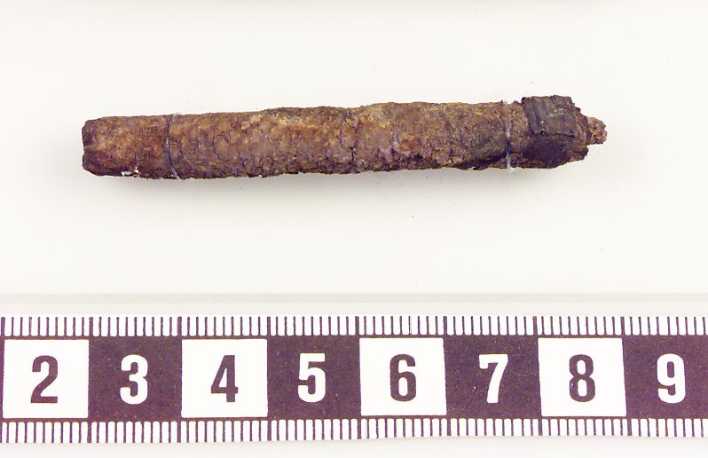 Nålhus av silvertråd över textil (1 yttre lager, möjligen siden, och ett inre, grövre lager). På utsidan prytt av silverband och glimmerskivor (de senare nästan helt avfallna). I Nålhuset finns 3 synålar i en ulltott.