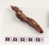Kniv med delvis bevarat träskaft vilket varit dekorerat med silvertråd. Delar av slidan bevarade i korrosionen.