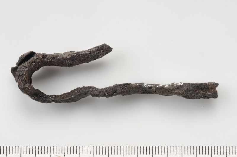 Järnring som vid återfinnandet var fästad vid 1 fragmentarisk fästemärla/ev krok.