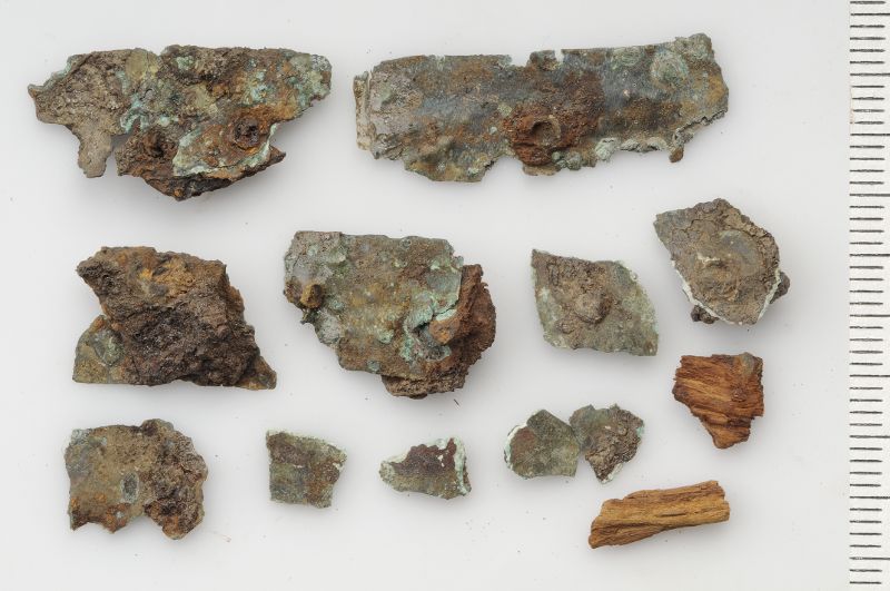 Ett 10-tal fragment av ett bronsbeslag med vidsittande järn- och trärester. Enl. Birka I ev. del av skölden.
