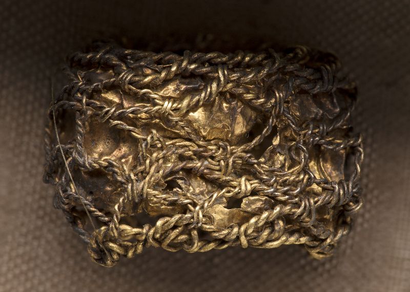 Pärla i dragen metalltråd runt guldfolie, samt band i flätad lantråd. Taf 34:3, 9
