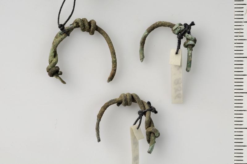 3 bronstrådsringar som varit fästade i en av spännbucklorna samt i nålhuset.