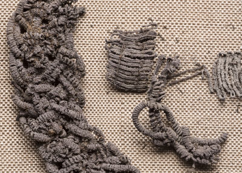 Rester av silverband. Bård i passament av silverspiral.
