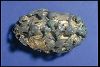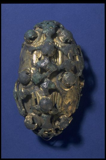 2 mycket tunga ovala spännbucklor av särtyp med rikt dekorerade, pånitade figurer. Undersidorna uppvisar textilavtryck.