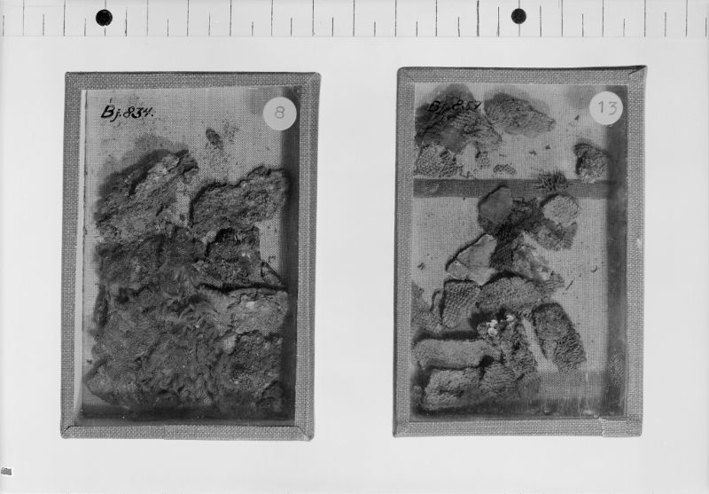 Små fragment av linnelärft. Treskaftad ylle. Grov röd yllevävnad. Mösnstervävd?