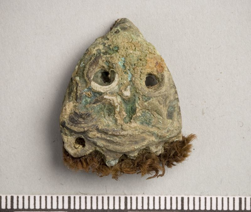 2 bronshakar, 1 med vidsittande textilrester (yllekypert & tuskaftat linne) och järnring. Bör ha hört till ett par strumpor eller ett par benlindor.