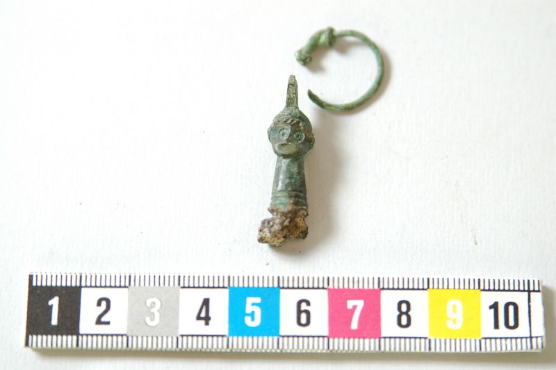 Sönderfallen pincett med överfångsgjutet antropomorft huvud, bärring av bronstråd sam tvidsittande mineraliserad textil (tuskaft).