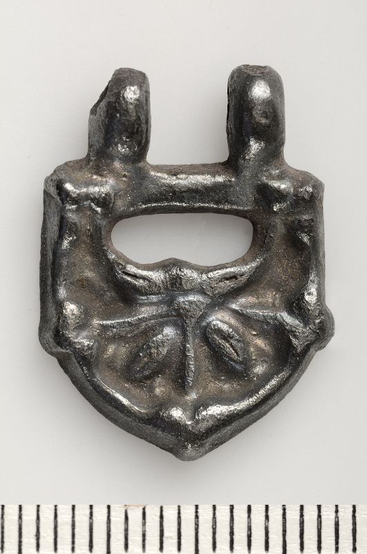 - Jmf. Birka I, Taf. 96:17. Mellan beslagets 2 öglor fanns 1 glaspärla.