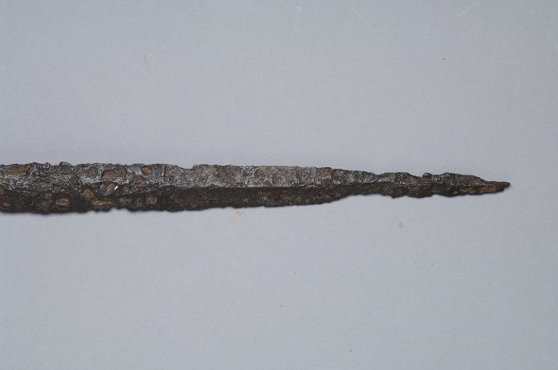 Långsmal spjutspets med 8 genomgående skaftnitar av brons.