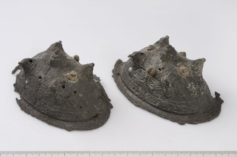 2 ovala spännbucklor av P 55-typ med delvis bevarade järnnålar med vidsittande textil.
