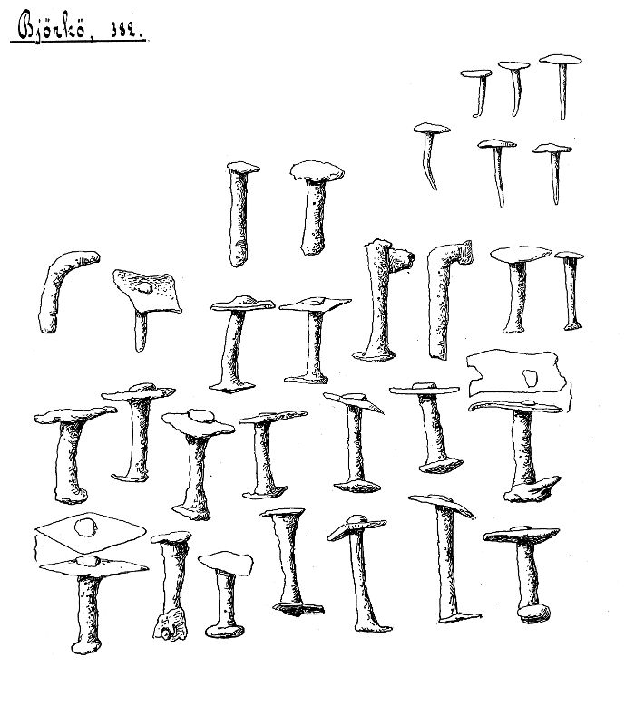 16 hela klinknaglatr, mer eller mindre skadade, 7 nitfragment, varav 1 nitbricka från liten nit, 2 spikar med platta spetsar, 5 stift (?) och 16 fragment från nitar och/eller spikar.