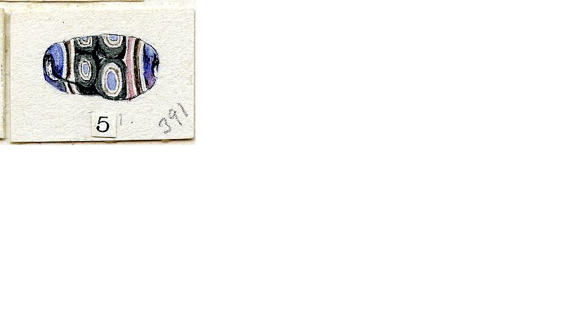 Pärlor: tunnformad, mellonformad, segmenterad, mosaikpärla, skadad av eld rundad pärla med "ögon", mycket skadad av eld rundad pärla och 12 glassmältar.