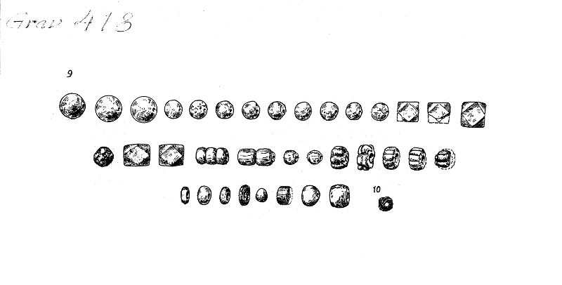 15 glaspärlor, varav 1 i 2 fragment, 1 fragment av glaspärla, 1 obränd och 2 brända karneolpärlor, 8 hela och 7 fragmentariska pärlor av bergkristall, 1 silverpärla.