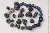 Ett 40-tal glaspärlor av olika färg och art - många eldskadade och delvis smälta, bl.a. flera mosaikpärlor.