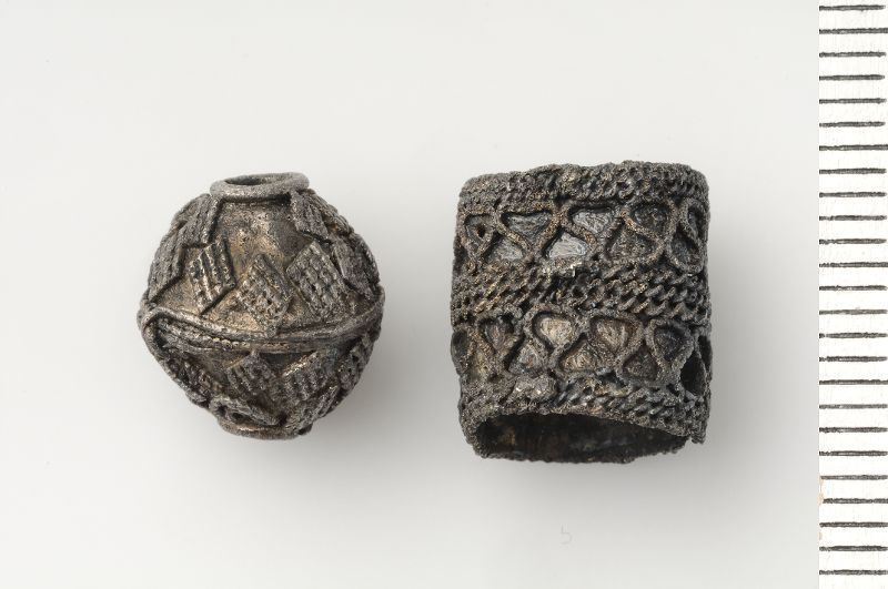 2 bikoniska pärlor, varav 1 hel pärla, 1 fragmenterade: 2 större fragment och 4 små bitar.