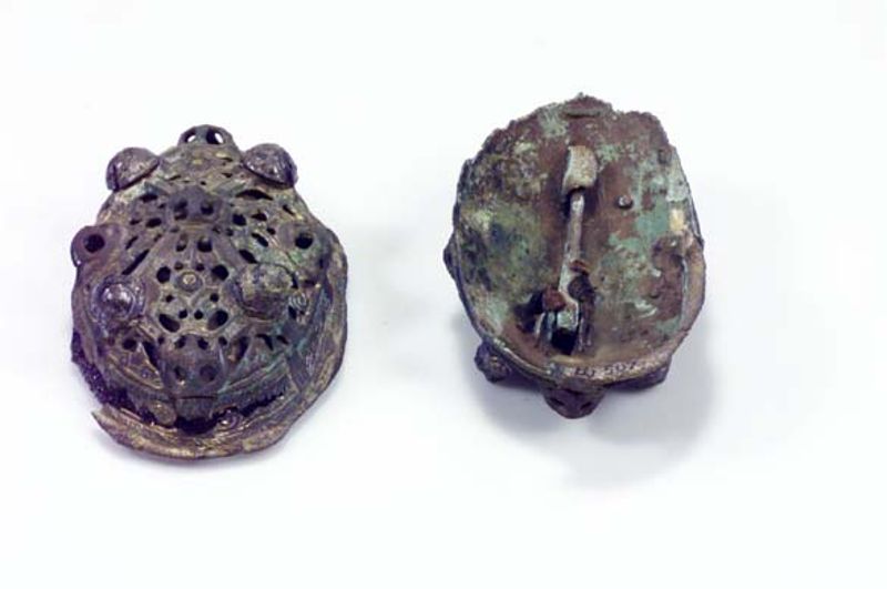 - brooch, tortoise brooch, bronze, copper alloy, textile, white metal