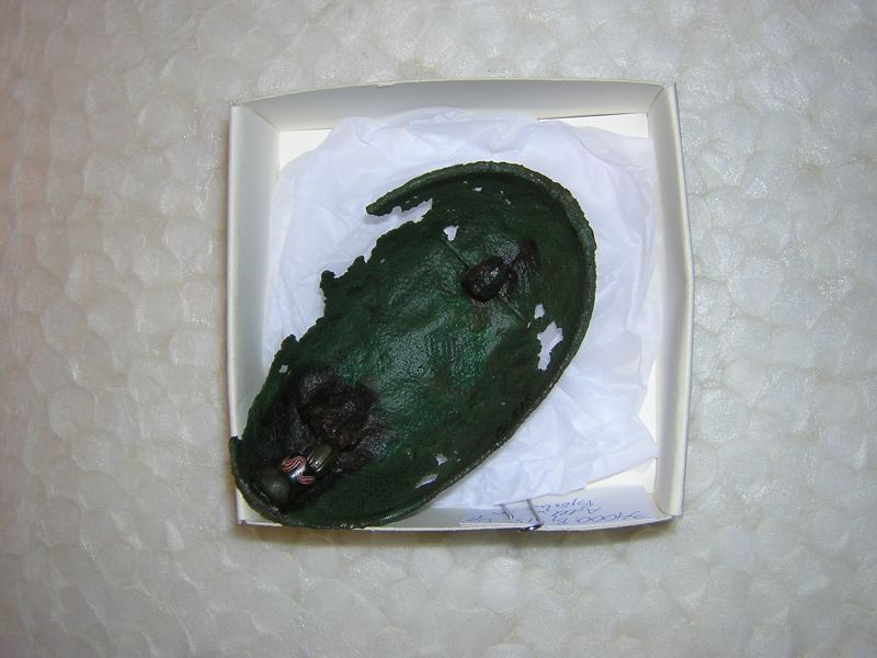 Enkelskalig, oval spännbuckla (p27b), med textilavtryck på insidan, järnnålen fattas. Vid nålfäste fastsittande 3 glaspärlor.