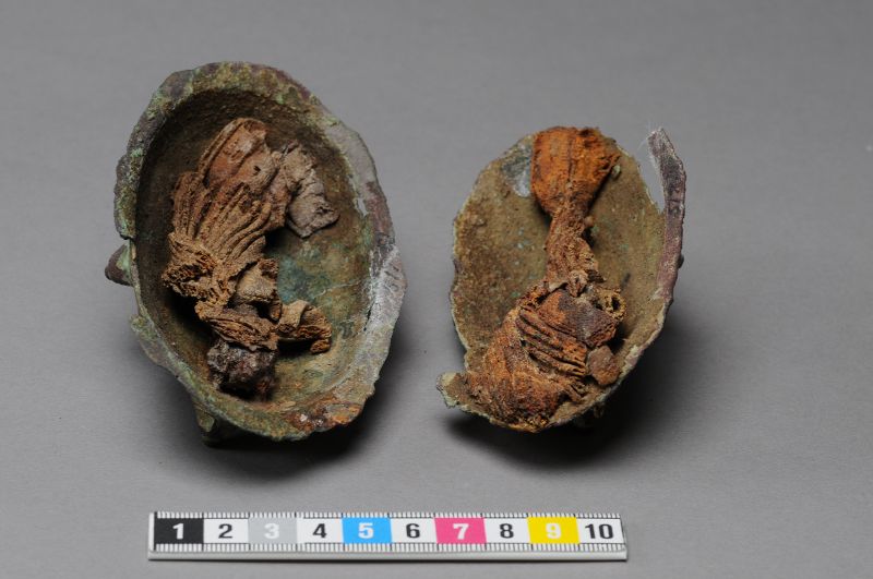 Skadade spännbucklor, vid järnnålar sitter fastkorroderade textilfragment av ull.