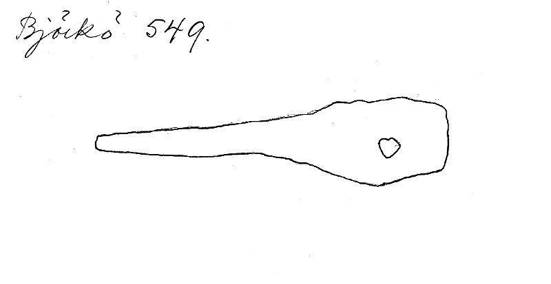 Föremålet är platt, spetsig i ena änden och hål i mitten av den breda delen.