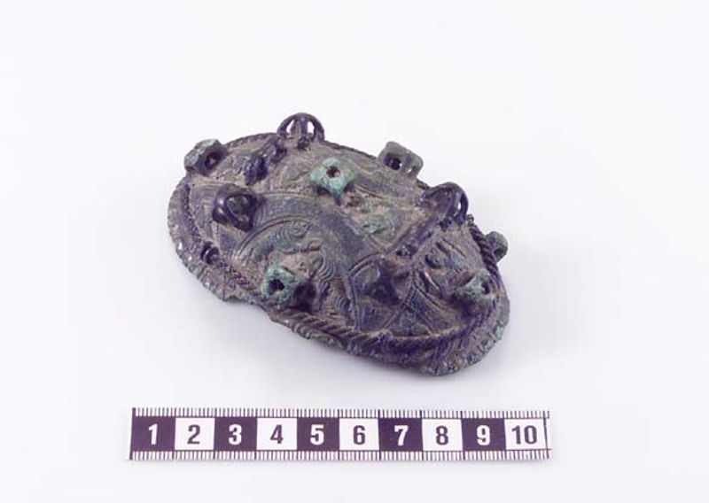 spänne (oval spännbuckla, p 23/24) av brons, förgyllning, silver, järn, textil